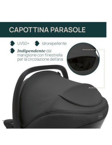 Dotato di un parasole UV50+ resistente all'acqua, indipendente dal manico di trasporto e con una finestra peekaboo per una maggiore circolazione dell'aria.
