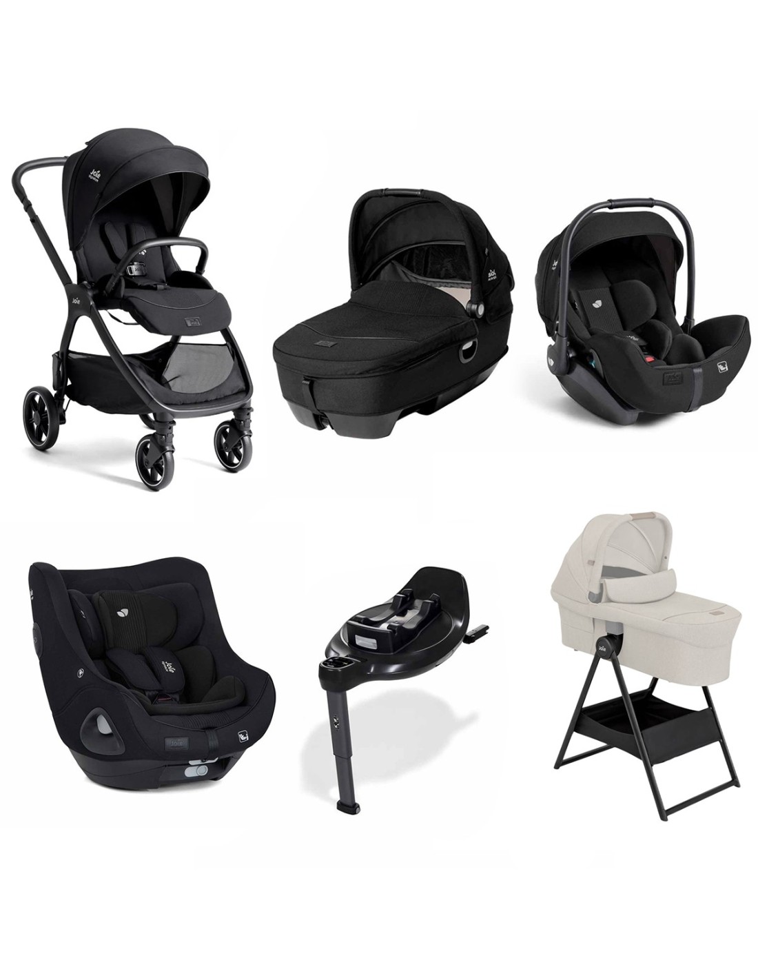 Trio di Joie che comprende il nuovo passeggino Valora, la navicella Calmi R 129, l'ovetto i-Level Pro, il seggiolino i-Harbour E e la base Encore.