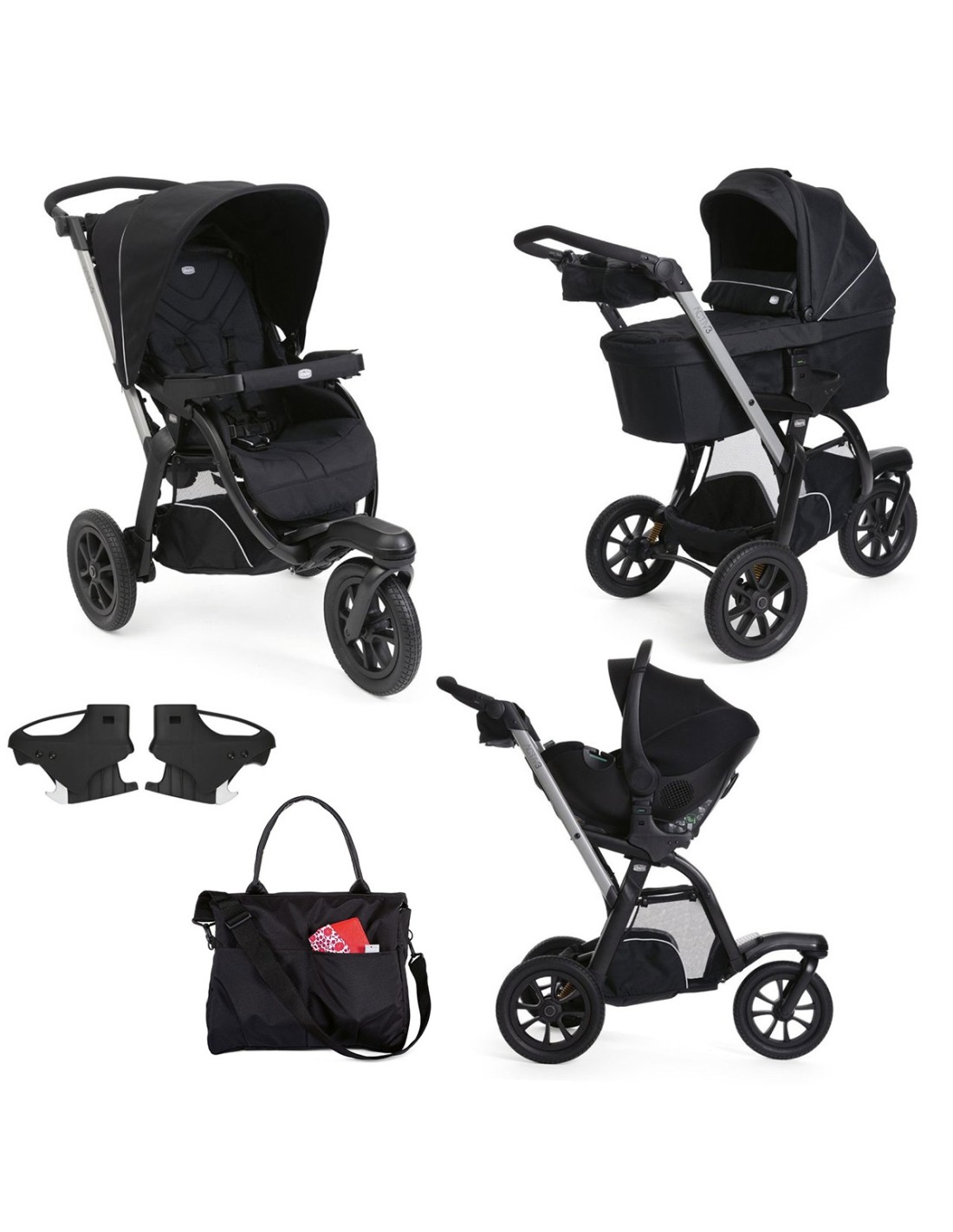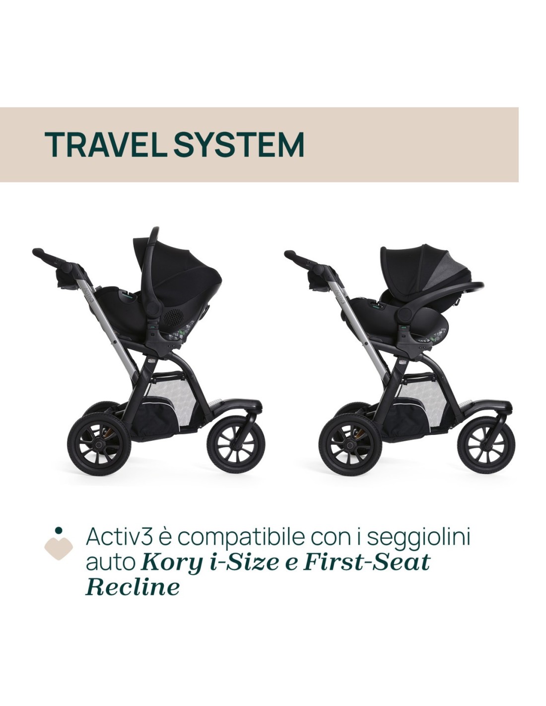 Il passeggino Activ3 è compatibile con i seggiolini auto Kory e First Seat Recline. Gli adattatori sono inclusi nella configurazione del passeggino.