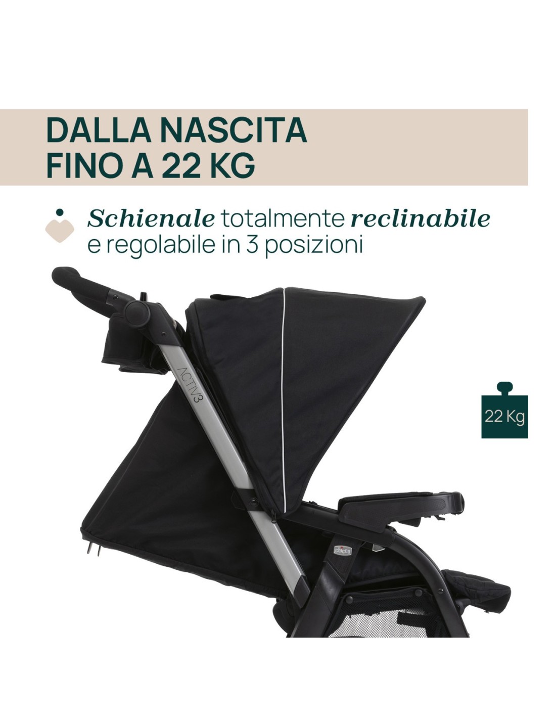 Omologato dalla nascita fino a 22 kg, grazie al suo schienale completamente reclinabile