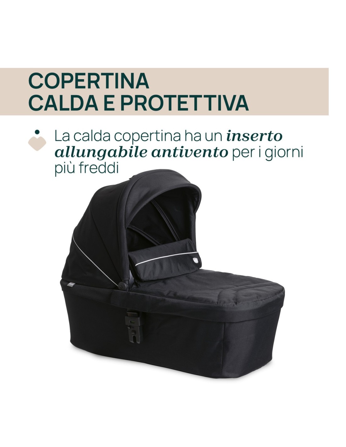La copertina della navicella può essere usata anche come coprigambe per il passeggino, per far sentire il bambino coccolato e protetto anche durante i giorni invernali. Regolabile in due posizioni per garantire sempre la migliore protezione e soddisfare ogni esigenza.