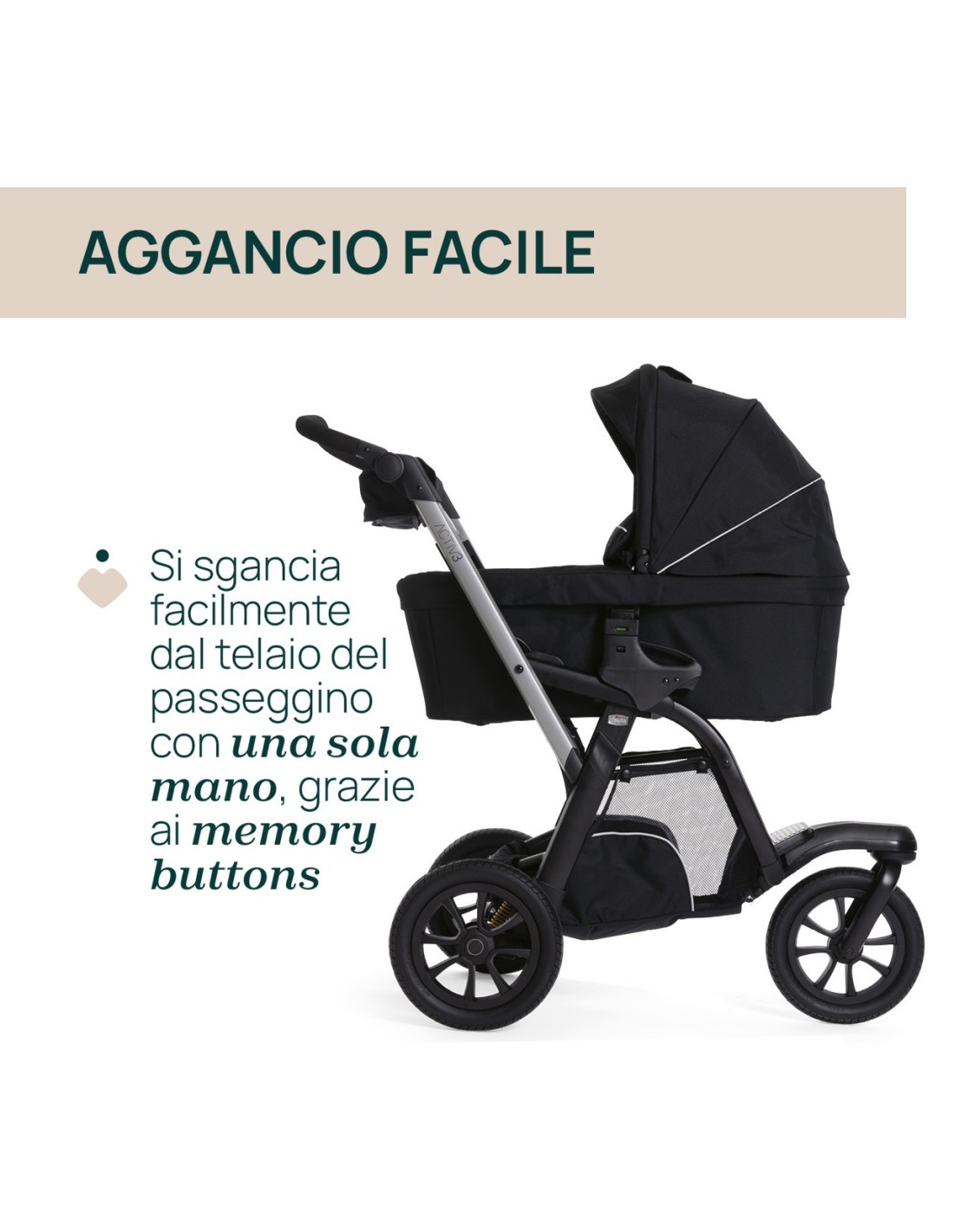 La navicella può essere agganciata e sganciata con una sola mano! Grazie ai pratici memory buttons, rimuovere la navicella dal telaio diventa estremamente facile.