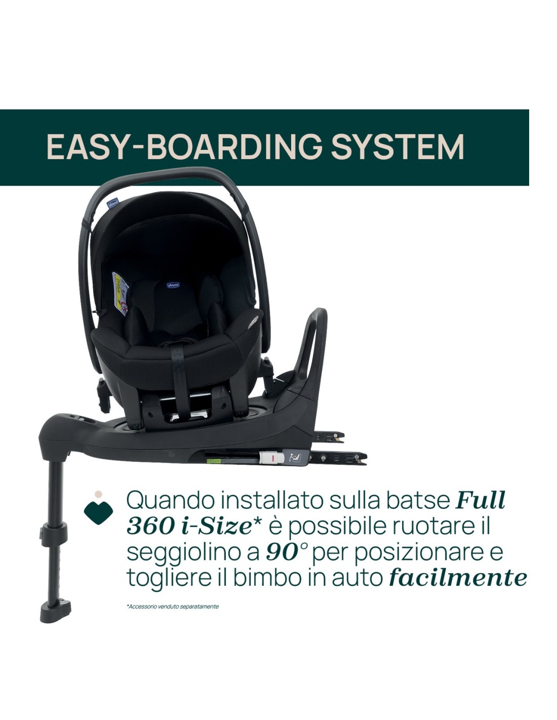Kory Essential i-Size può essere installato con la base Full 360 i-Size che offre un posizionamento rapido e senza sforzo del bambino in auto (la base non è inclusa).