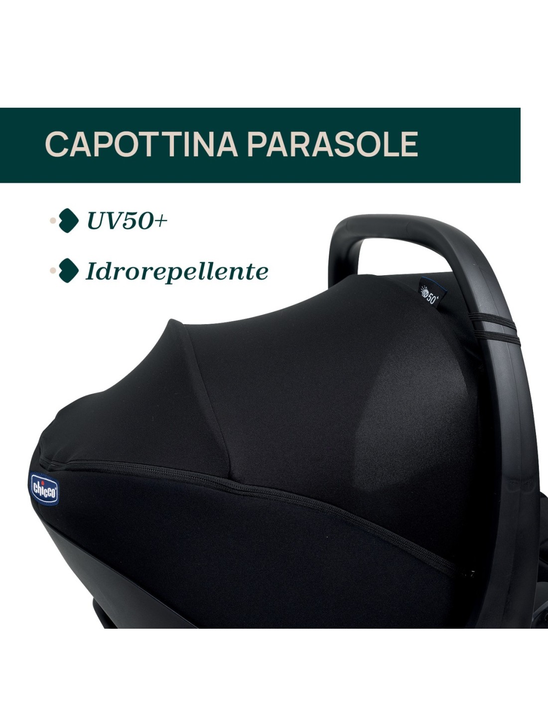 La capottina assicura sempre la migliore protezione per i bambini grazie al segmento estensibile, alla protezione UV50+ e al trattamento anti pioggia. Per mantenere il contatto visivo con il bambino, sulla parte superiore è presente una pratica finestrella in rete.