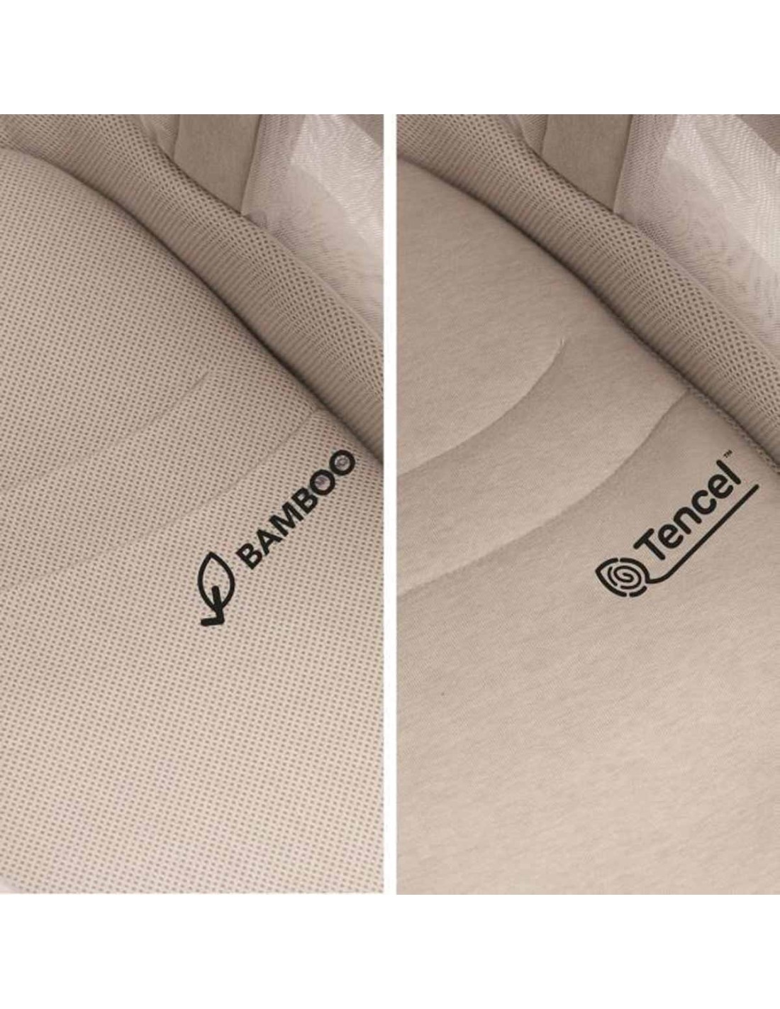 Tutti i materiali interni sono in fibre naturali e morbide, ideali per la pelle delicata del bambino. Il materasso, progettato per un utilizzo su entrambi i lati, offre una rete di bambù 3D traspirante da un lato e un morbido TENCEL™ Lyocelldall'altro.