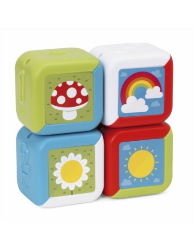 4 diverse attività manuali: premi il fiore per ascoltare un divertente effetto sonoro, apri la finestrella, gira gli ingranaggi e gira la ruota