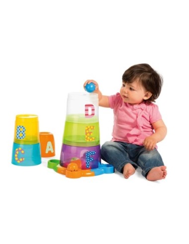 La base è un coloratissimo puzzle che permette di sviluppare la capacità di associazione ed imparare i colori, invece le sei tazze impilabili insegnano le lettere dell’alfabeto.