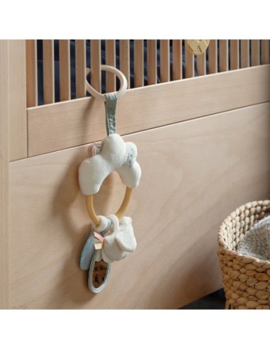 Nella parte superiore della nuvola è presente un anello a C, che consente di appendere il giocattolo attività sulla capote di una carrozzina, passeggino o seggiolino auto per stimolare e attivare i sensi del bambino in movimento.