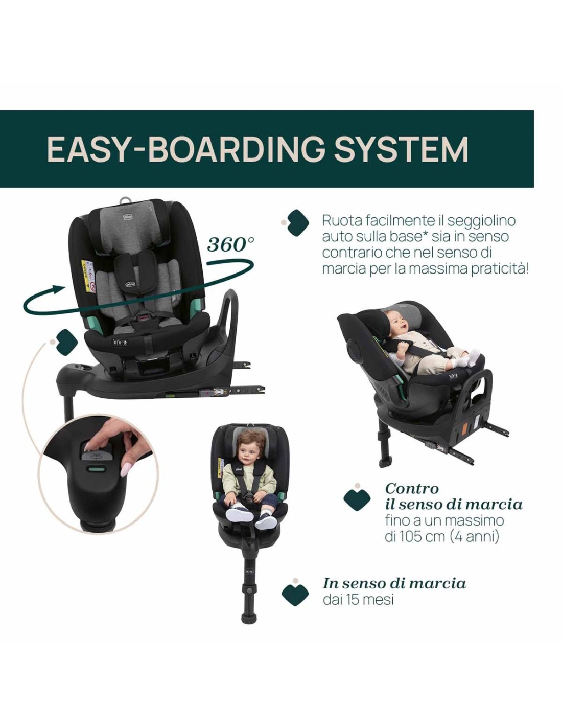 Sulla base rotante, puoi posizionare comodamente il tuo bambino nella posizione a 90°, sia in senso contrario che in senso di marcia fino a 105 cm (circa 4 anni). L’utilizzo prolungato in senso contrario di marcia fino a 105 cm offre una maggiore protezione per collo e testa in caso di impatto.