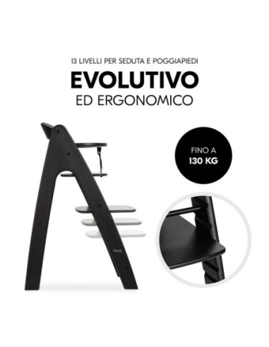 Più grande è il tuo bambino, più basso deve essere il seggiolone. Grazie ai 13 livelli per seduta e piedi, puoi regolare Arketa in qualsiasi momento. Dai bambini piccoli agli adulti: qui tutti siedono bene.