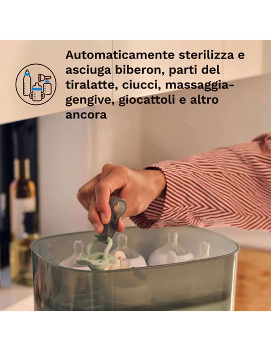 Sterilizza e asciuga automaticamente il 33% più velocemente tutte le marche di biberon,parti del tiralatte e accessori.