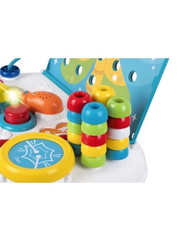 Dotato di un'rea di impilamento e fori di stoccaggio per 20 pioli e 4 ingranaggi in 4 colori; 1 tamburo con 1 bacchetta; abaco con 5 anelli scorrevoli.