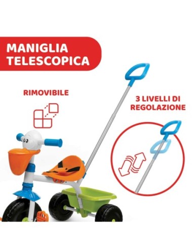 - Il triciclo con maniglione telescopico regolabile in altezza si adatta alla statura dei genitori, consentendogli di spingerlo con facilità