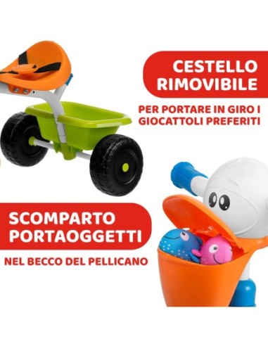 - Il becco del pellicano è un simpatico contenitore segreto in cui riporre giochi o oggetti cari al bambino; dietro al sellino è presente un altro cestello portaoggetti spazioso e rimovibile