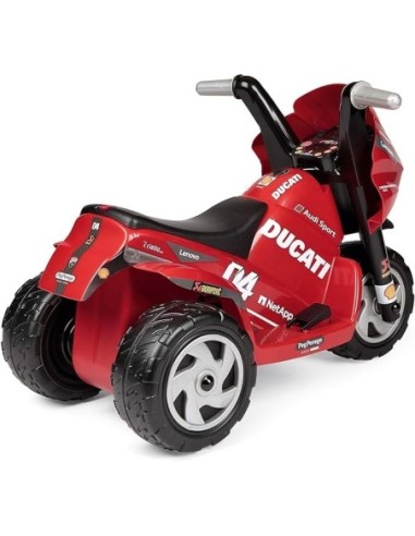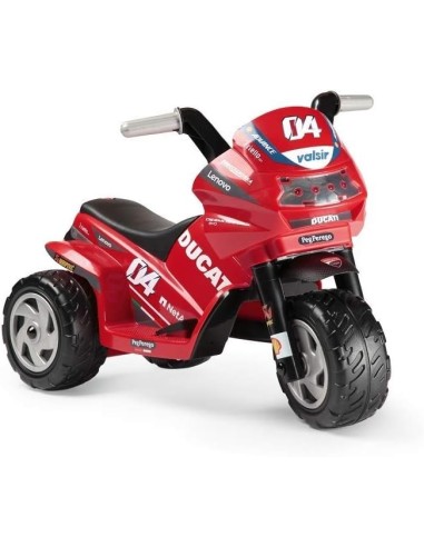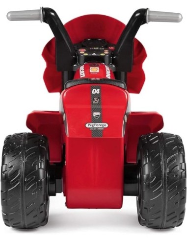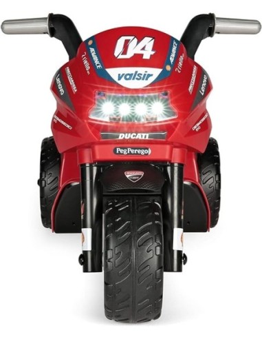 Ducati Mini EVO mostra tutta la sua “EVOluzione” con caratteristiche ancora più performanti. Luci, suoni, melodie, clacson e tutta la sicurezza dei materiali made in Italy per divertirsi già da 1 anno. La moto elettrica funziona con batteria ricaricabile da 6V - 4,5Ah (25Wh).